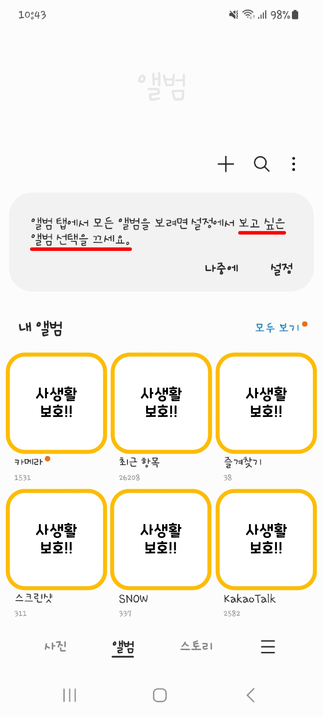 안드로이드 업데이트로 인해 '보고 싶은 앨범'이라는 신규 기능이 추가되어 발생한 상황이었는데요~ 사생활 보호 등의 목적을 위해 앨범을 자유자재로 숨기고 꺼내며 설정할 수 있는 기능이라 나름 유용하겠구나 싶어요.