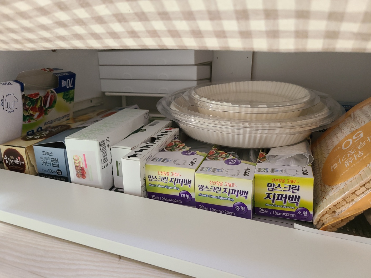 그리고 이렇게 주방 관련 물품들을 종류별로 넣어두고, 문 대신 천을 붙여두었답니다. 주방 바로 옆이다보니 사용하기 너무너무 편리하고 만족해요! 때로는 이렇게 과감한 도전도 추천드립니다~