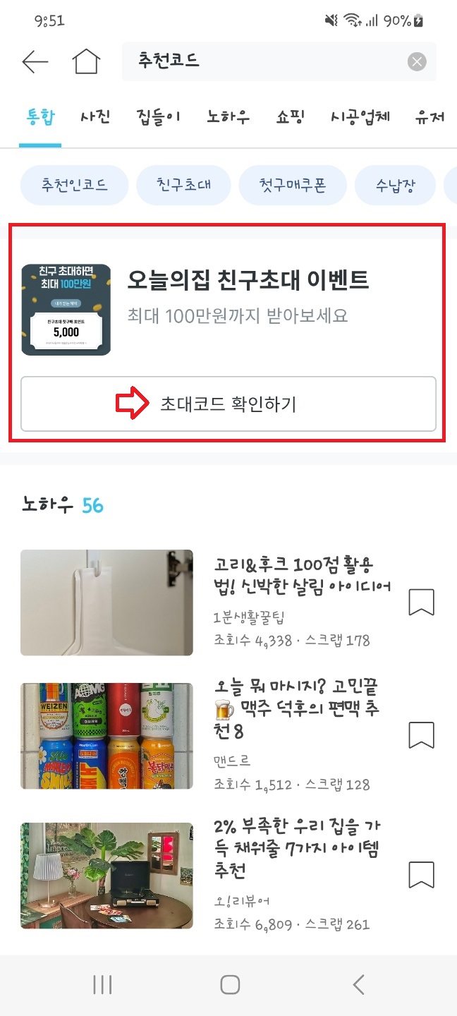 오늘의집 검색창에 '추천코드'를 입력하면 '오늘의집 친구초대 이벤트' 배너가 최상단에 뜨게 됩니다. '초대코드 확인하기'를 클릭하면 손쉽게 나의 추천코드를 확인할 수 있어요. 친구에게 초대링크 공유, 초대코드 공유를 통해 쏠쏠한 혜택 놓치지 말고 서로서로 챙겨보아요.