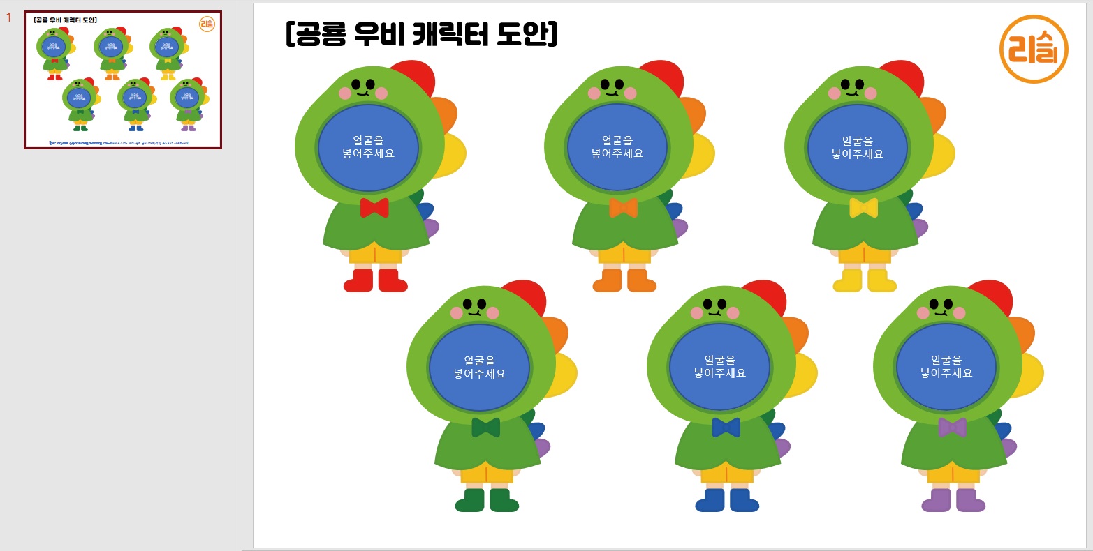공룡 캐릭터 합성 도안은 위 사진과 같은 구성으로 PPT파일 공유해드립니다. 원형 칸을 넣어 두었으니 아이들의 얼굴을 더욱 손쉽게 넣으실 수 있어요. 도안의 크기는 늘려도 깨지지 않으니 필요한 사이즈에 맞게 조절해서 사용하셔도 됩니다.