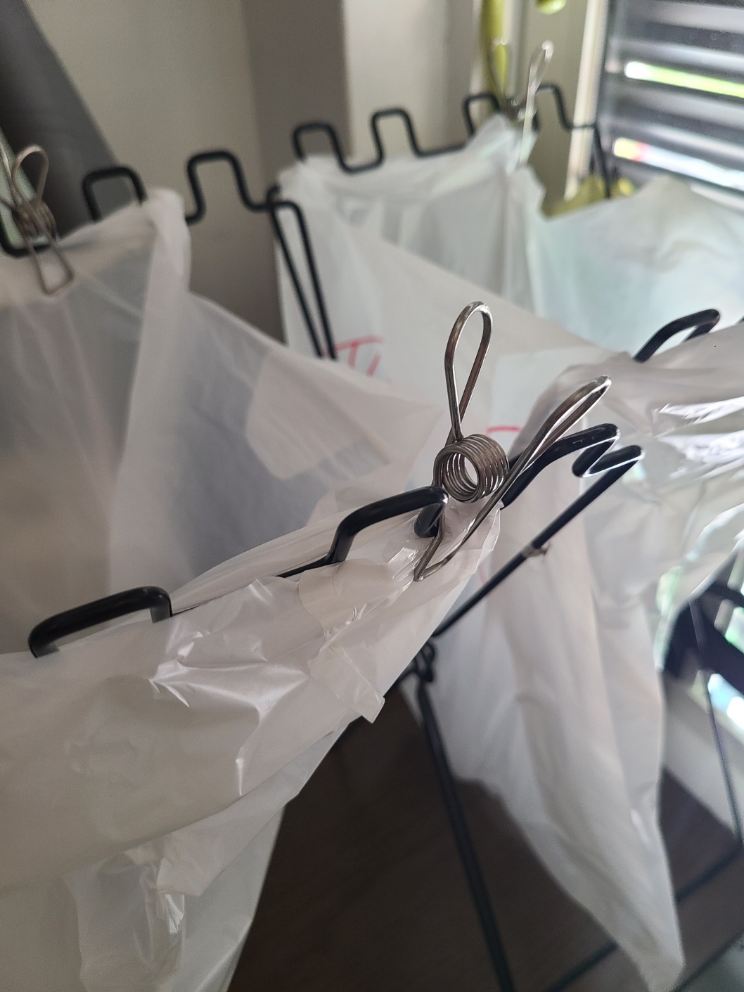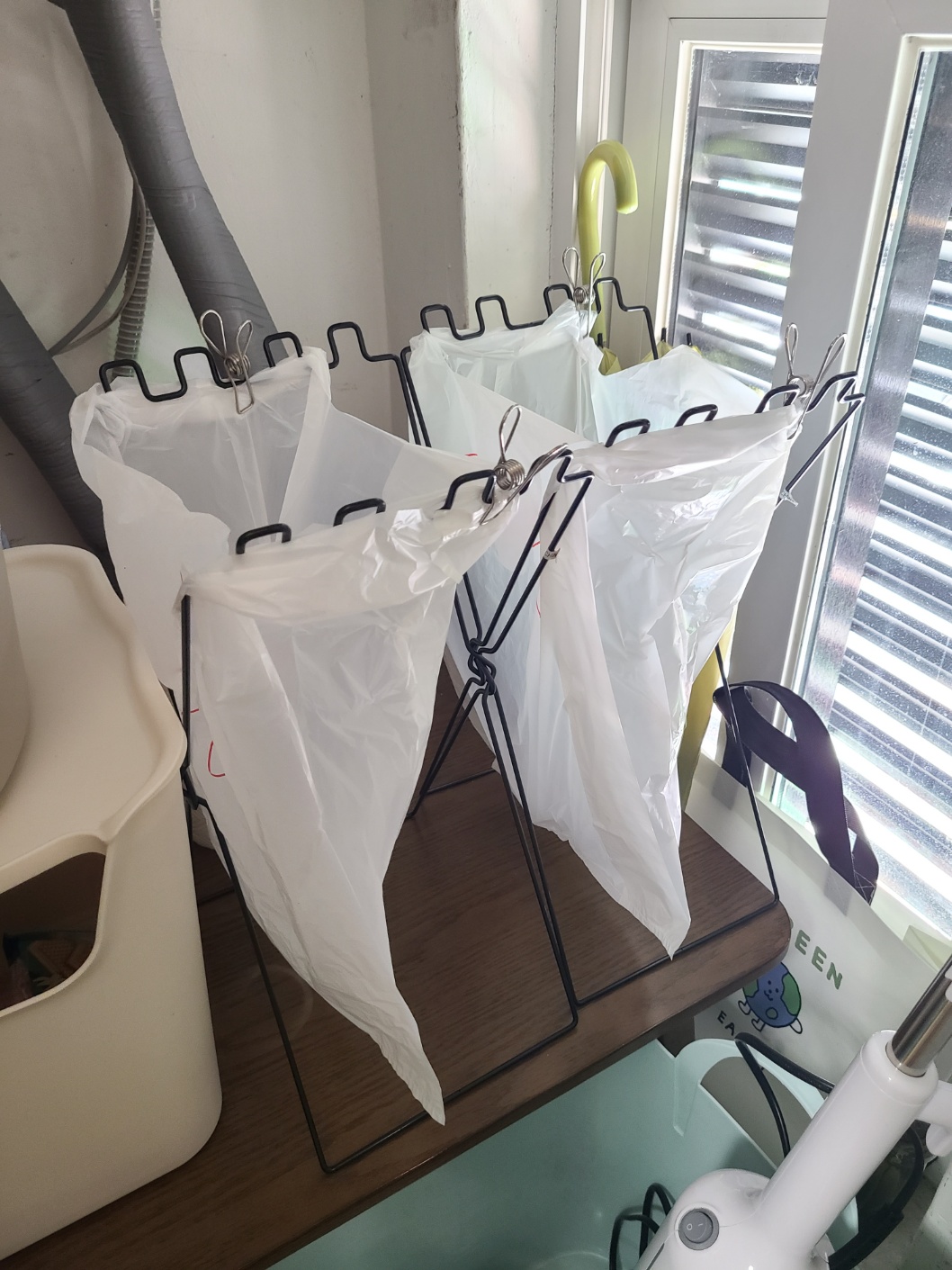 비닐봉지에 비닐, 플라스틱을 적어 쓰레기봉투 거치대에 손잡이를 끼워넣으면 편리하게 분리수거 하고, 바로 내다버리기 너무 편해요. 쓰레기 봉투 손잡이를 고정하는 끝 부분에 집게를 꽂아 놓으면 봉투가 떨어질 염려 없이 봉투가 꽉 찰 때까지 튼튼하게 사용할 수 있습니다.