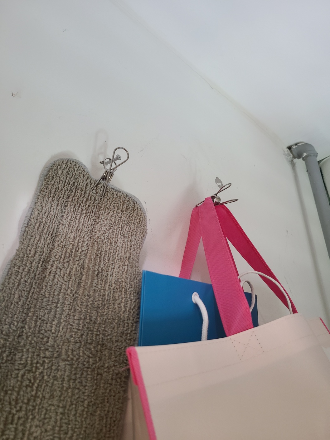 활용 용도로는, 이렇게 물걸레도 걸어서 건조하고 종이백을 모아두는 쇼핑백이 떨어지지 않도록 고정 용도로도 활용하고 있어요. 원룸 이곳 저곳에 걸려있던 못에 고리를 활용해서 만족스럽게 수납하고 있습니다.
