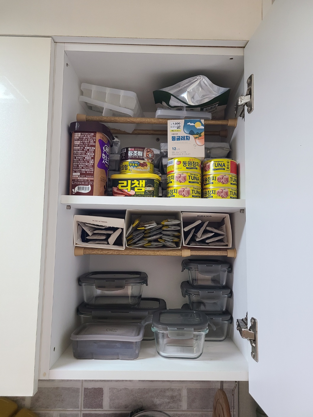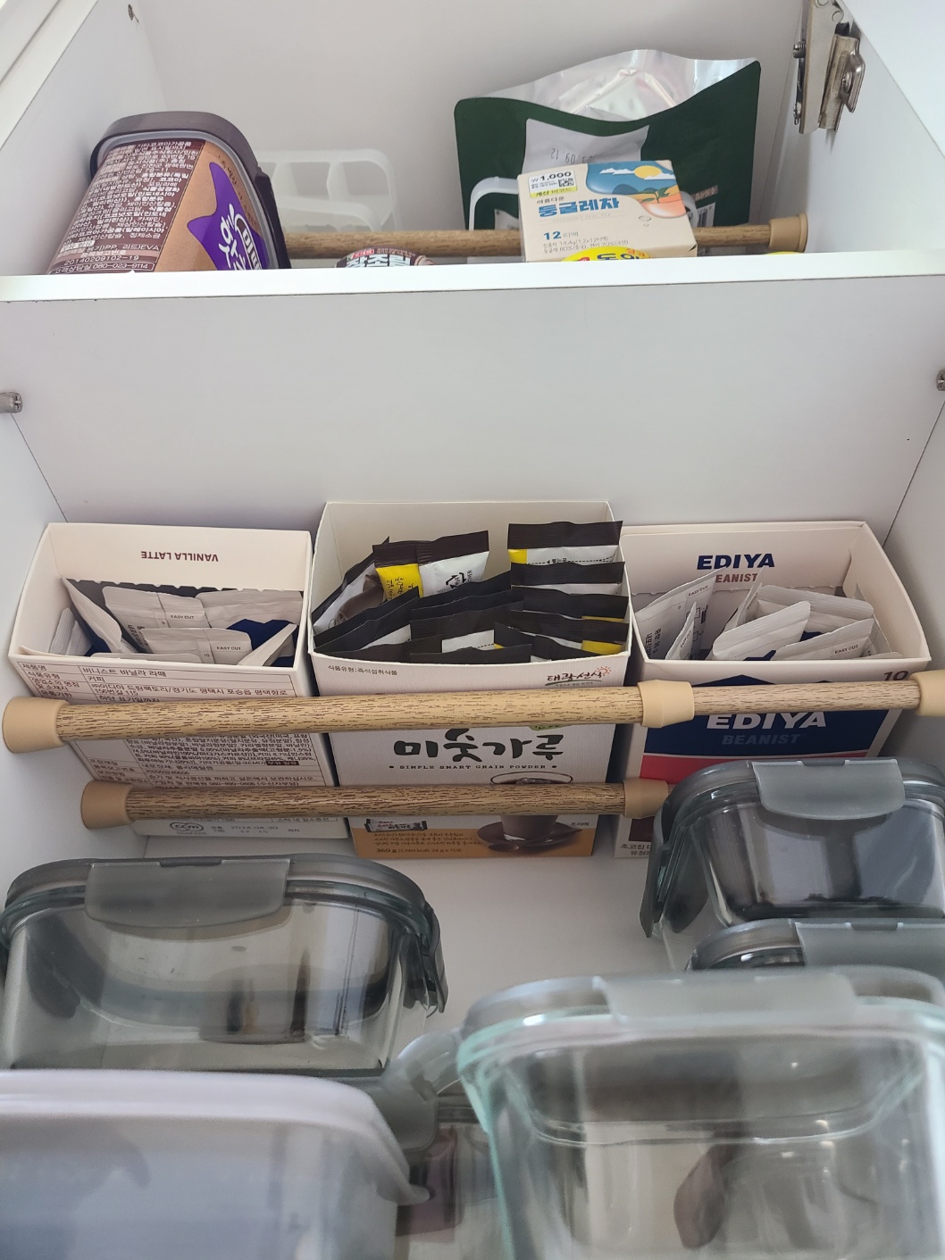 이렇게 압축봉으로 수납장 상단의 애매하게 남는 부분을 또 다른 수납 공간으로 만들어보았습니다. 저처럼 커피, 미숫가루 등의 자주 마시는 티백류를 보관하시면 하나씩 편리하게 사용해서 마시기 좋아요. 압축봉은 꼭 활용해보시기 추천드립니다.
