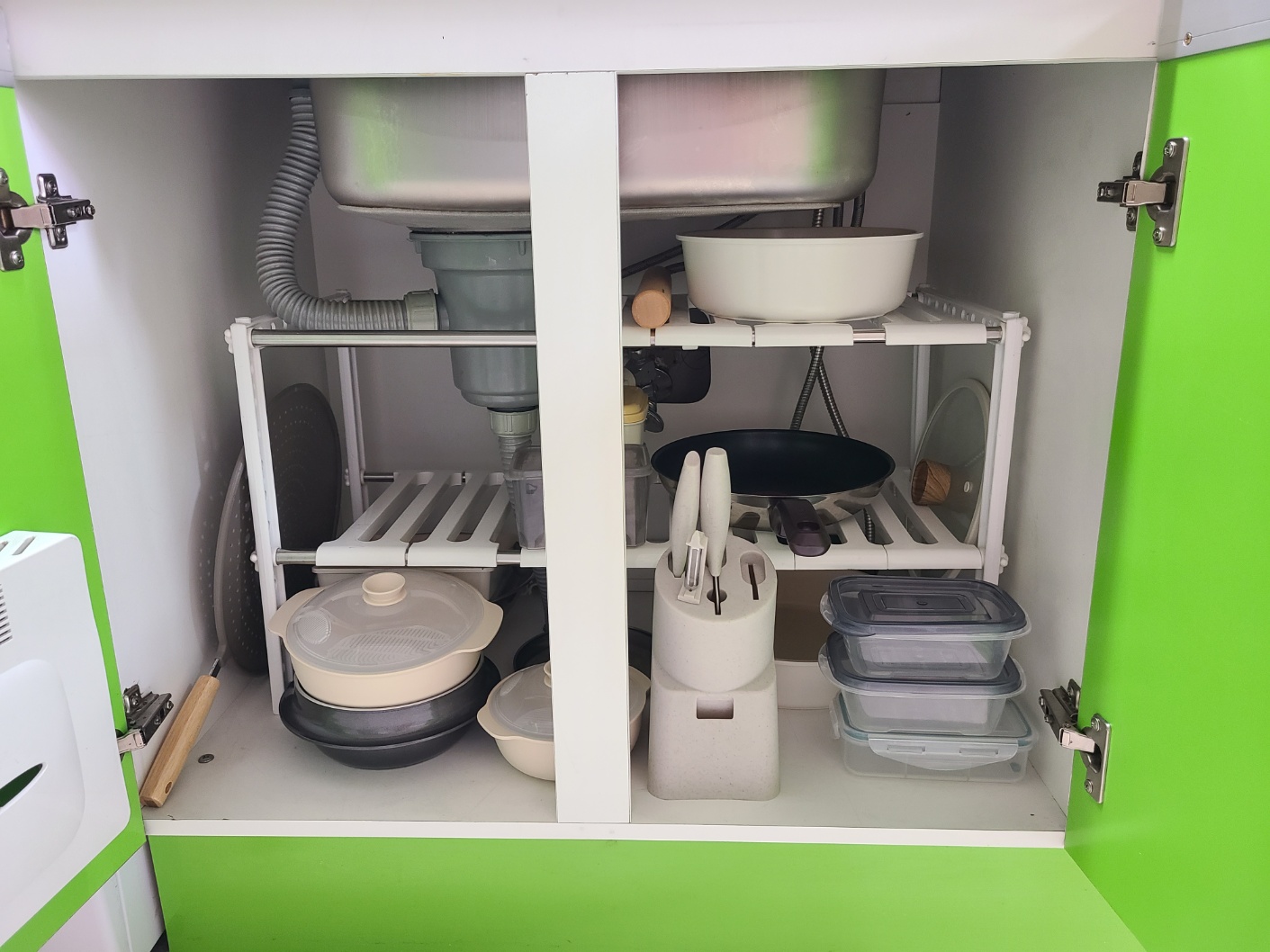 압축봉에 이어 주방 수납공간을 보다 효율적으로 사용하기 위한 두번째 꿀템은 바로 '길이조절 싱크대 선반'입니다! 저는 창신리빙 길이조절 싱크대 선반을 약 2만원에 구매했어요. 싱크대 하부장은 각 원룸마다 크기가 제각각인대요~ 이렇게 길이조절용 선반을 구매하면 각 원룸에 딱 맞는 사이즈로 조절해서 공간을 완벽하게 활용할 수 있어요!