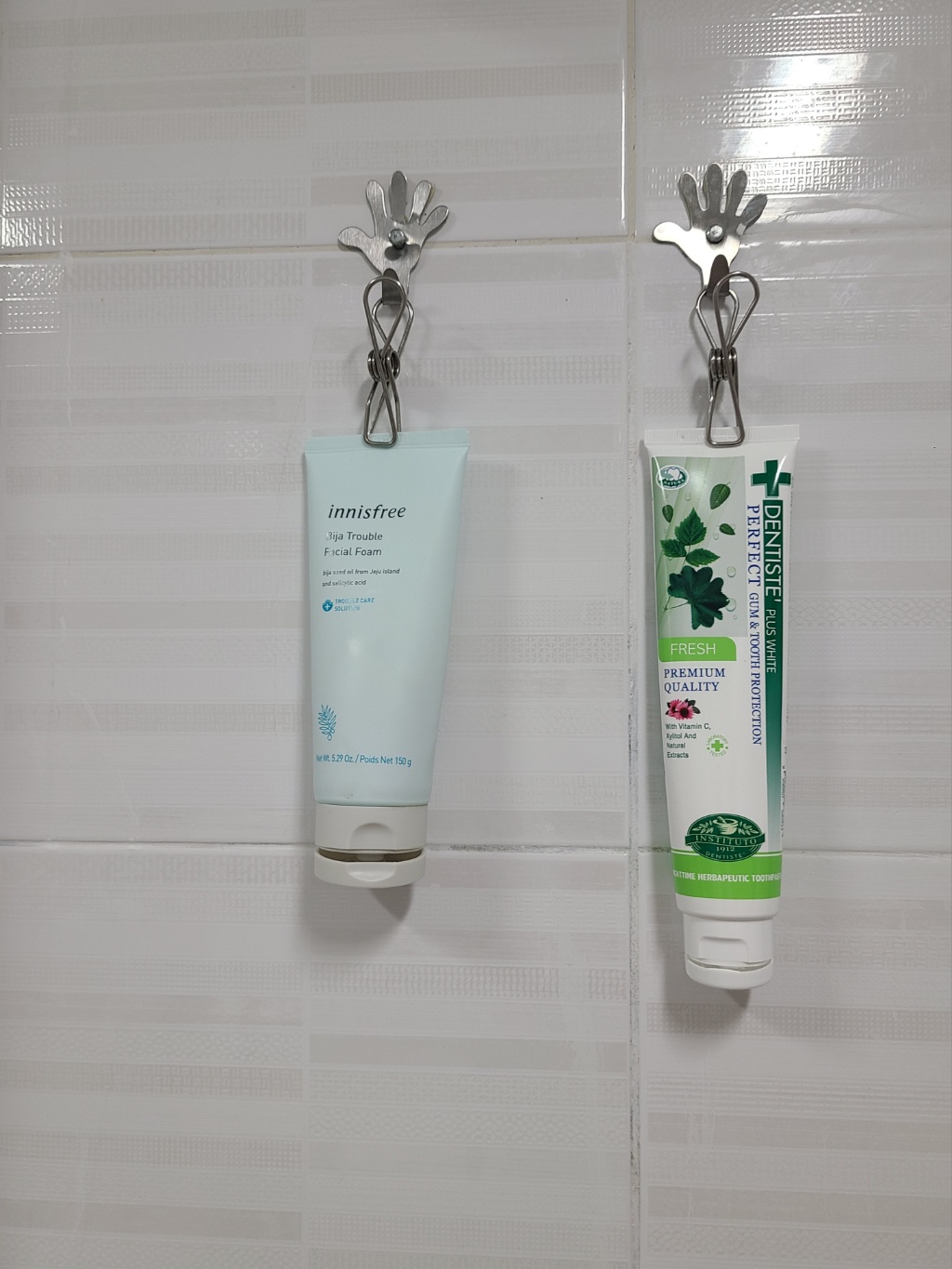 아늑한 화장실~ 매일 사용하는 폼클렌징, 치약도 고리에 걸어 공중부양 방법으로 사용하고 있어요! 물때가 낄 염려도 없고, 다이소 고리가 폼클렌징이나 치약 정도 무게는 거뜬하게 버텨요. 지금까지 쭉 집게 고리에 걸어 사용하고 있는데 한 번도 떨어진 적이 없습니다.