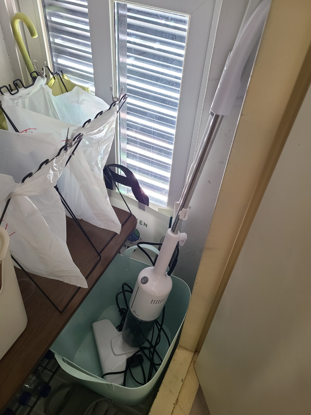 청소기 보관을 보일러실에. 이렇게 적당한 바구니 하나 준비해두면 선 정리 할 필요도 없이 휙~ 꺼내고 넣으며 사용하기 편리해요! 저는 충전해가며 사용해야 하는 무선 청소기보다 이렇게 대충 보관하며 사용하는 유선 청소기가 편리하더라구요! 다만 투룸 이상이라면 편의상 무선 청소기를 추천합니다~