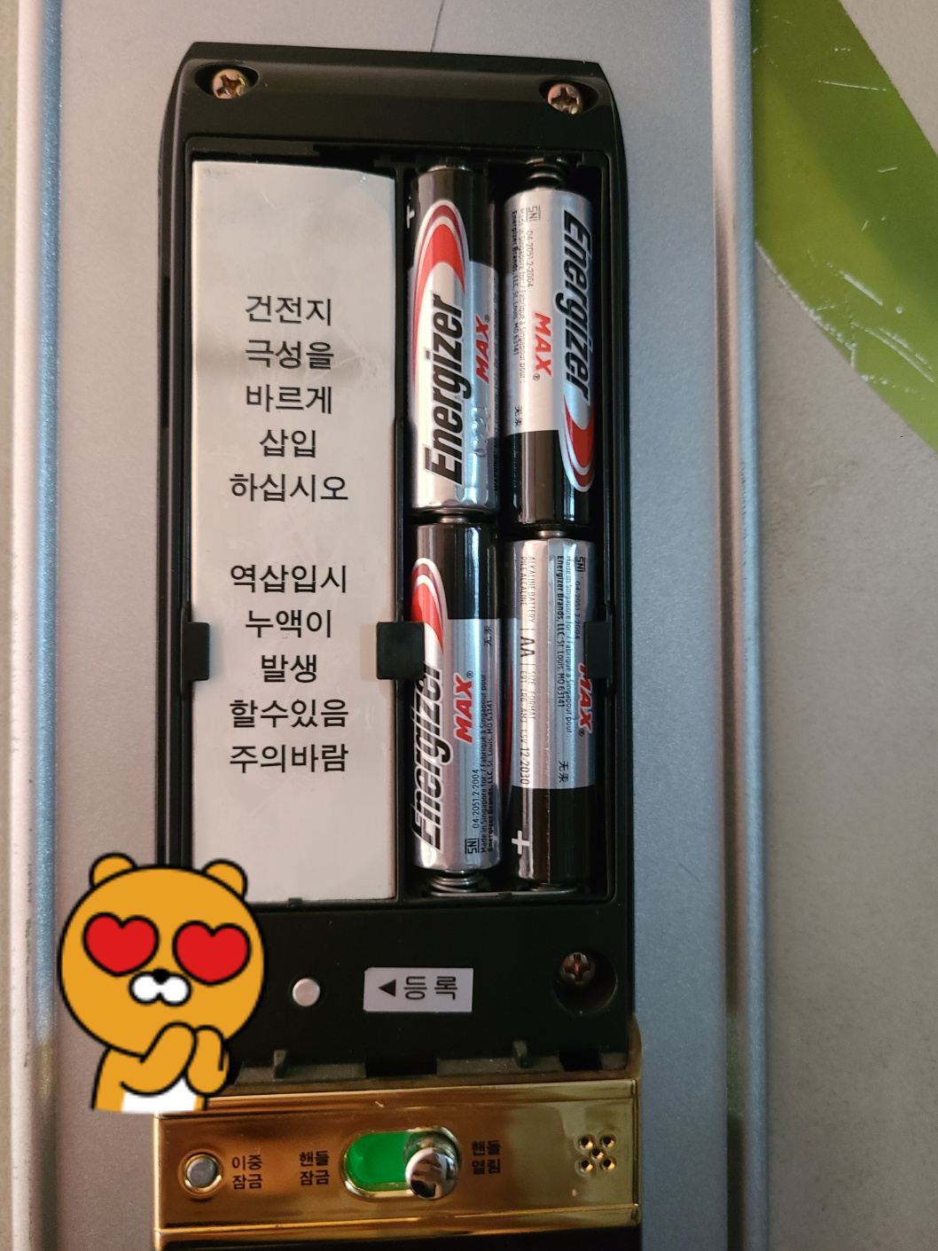 도어락의 건전지 커버를 열면 이렇게 '등록'버튼이 보여요.