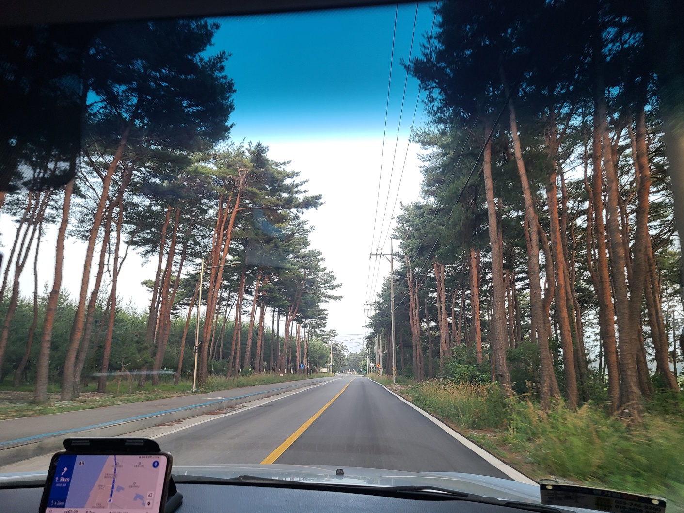 물놀이를 한시간 반 가량 신나게 하고 숙소로 돌아와 젖은 옷을 정리하고 잠시 쉰 후, 저녁을 먹으러 강문 해변거리로 떠났다. 여행지는 주변 풍경 하나하나가 낯설고 설레게 느껴지는 것 같다. 강문 해변거리로 떠나는 길에 만난 소나무 길도 너무 예쁘게 느껴졌다. 피톤치드가 가득할 것 같은 자연의 느낌. 매일매일 이렇게 여행하는 기분으로 살면 매일이 행복하겠다.