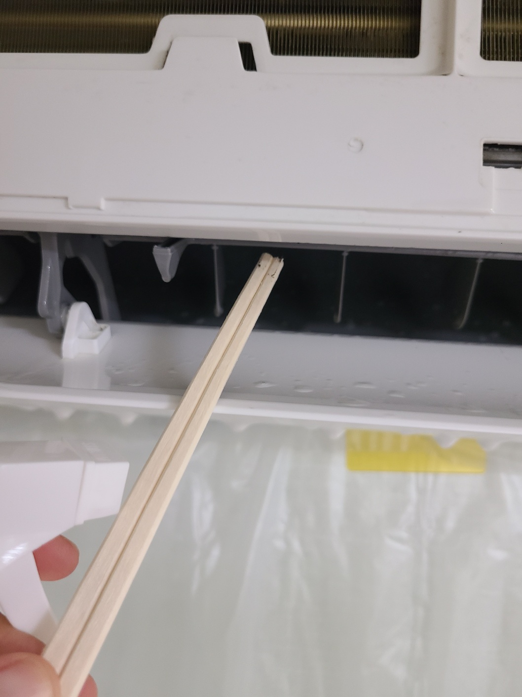 다음 차례는 에어컨 바람이 나오는 송풍구! 송풍구 뒷면과 송풍팬이 곰팡이 주요 서식지입니다.. 송풍팬은 젓가락으로 돌려가며 골고루 세척제를 뿌려주세요.
