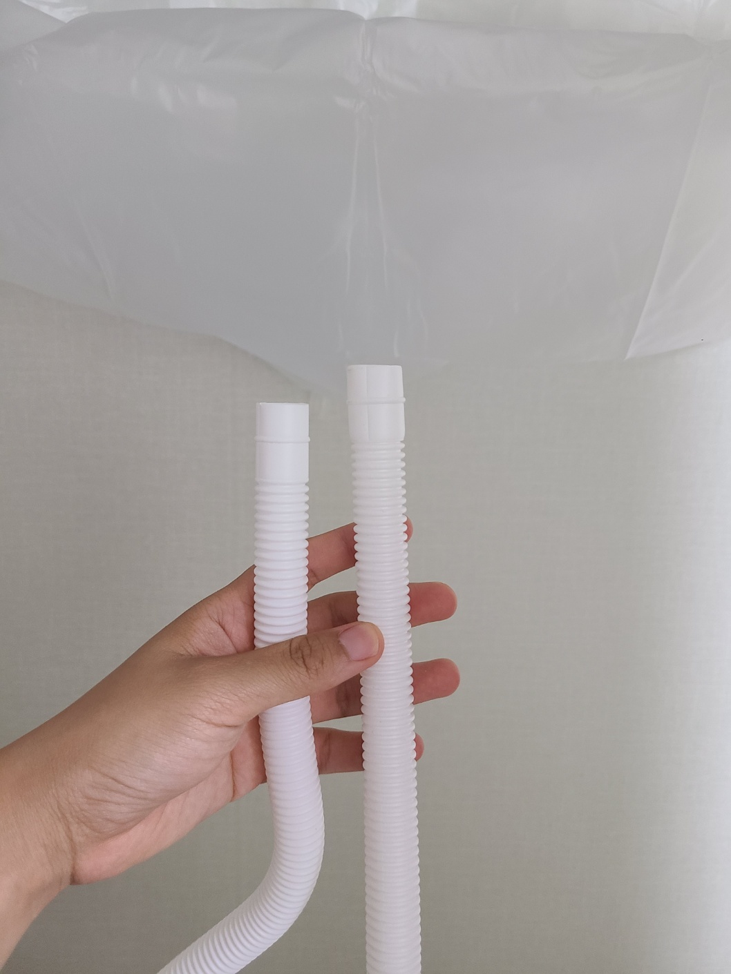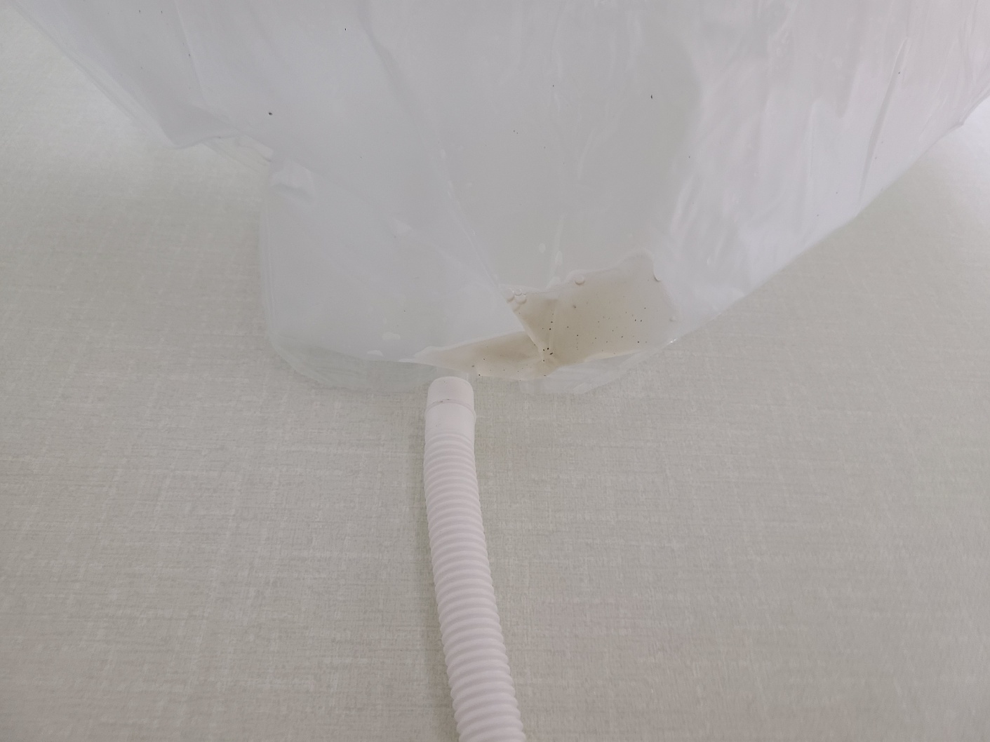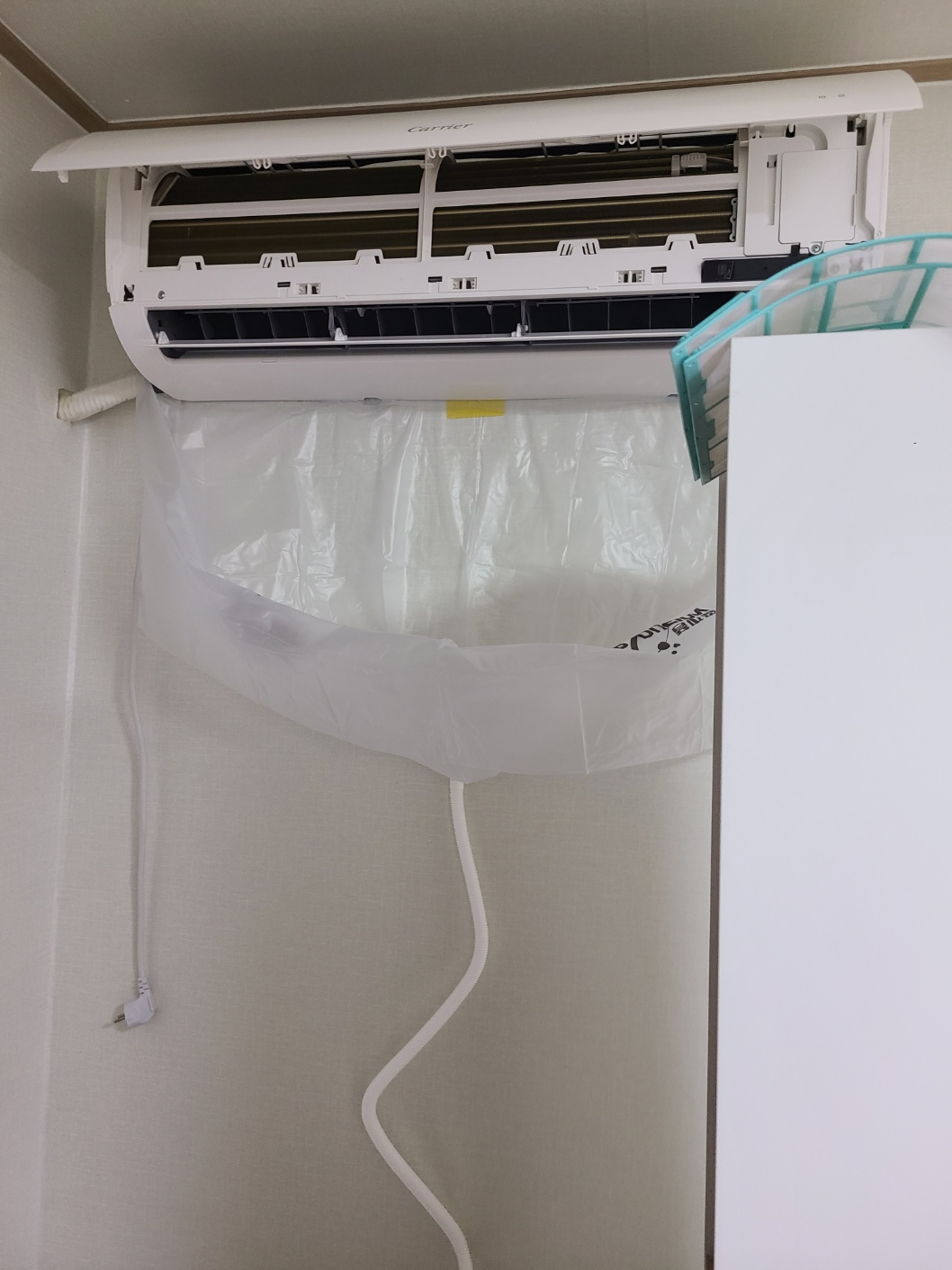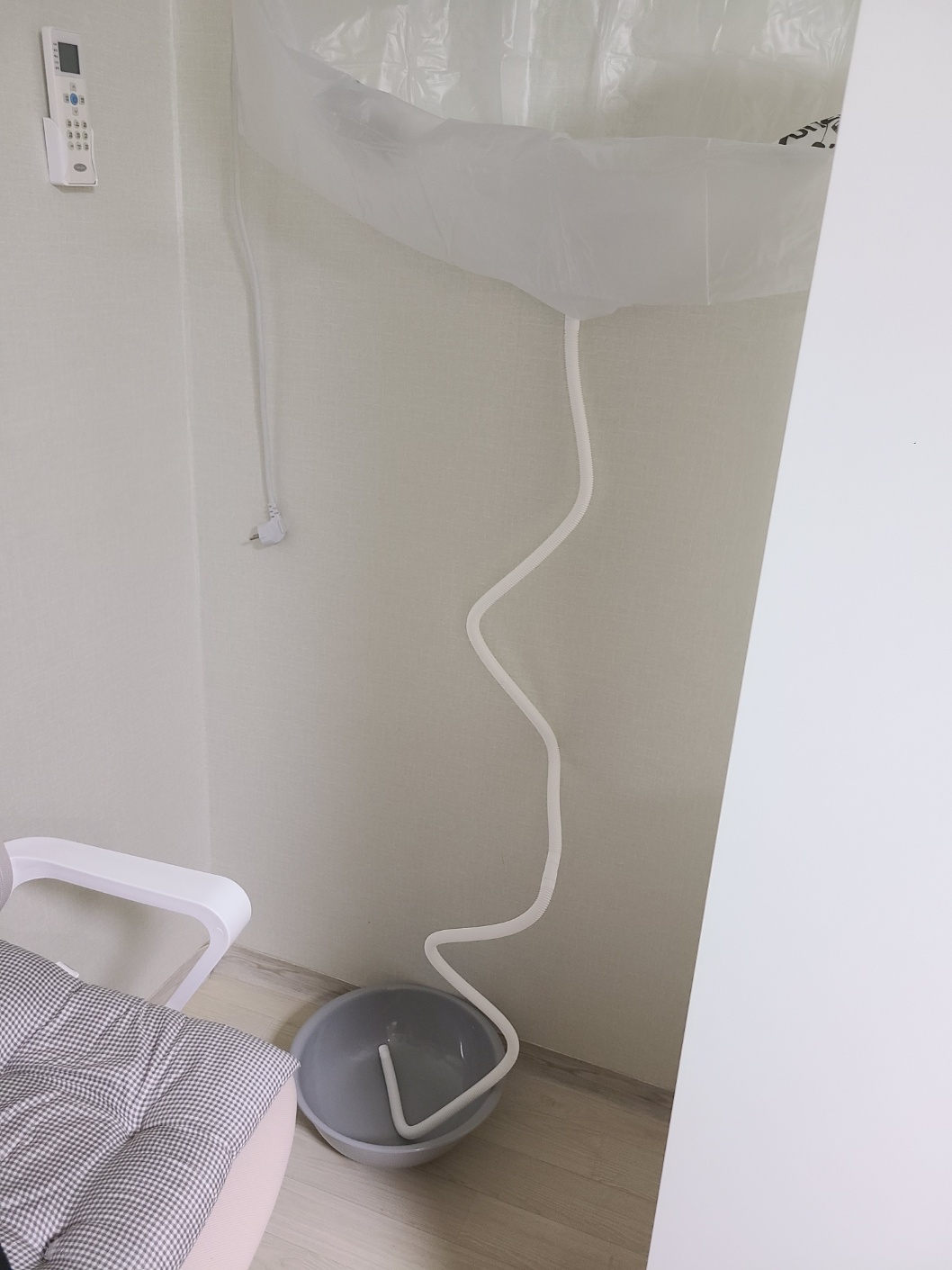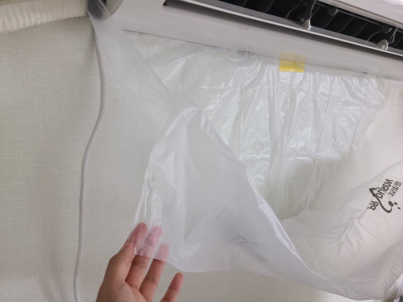 에어컨에서 흘러나오는 구정물이 비닐 아래쪽으로만 모이는 것이 아니라, 에어컨 곡선을 타고 뒤로 흘러 뒷면이 많이 젖더라구요. 그래서 뒤쪽 비닐을 깊게 밀어넣어 두시기 추천드려요ㅠㅠ