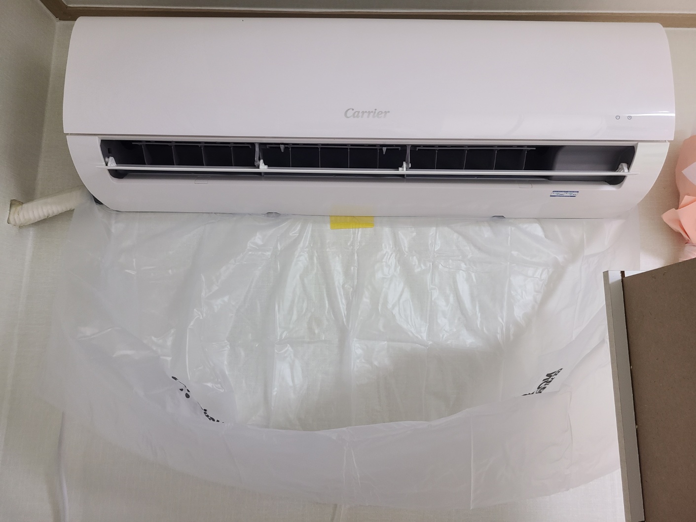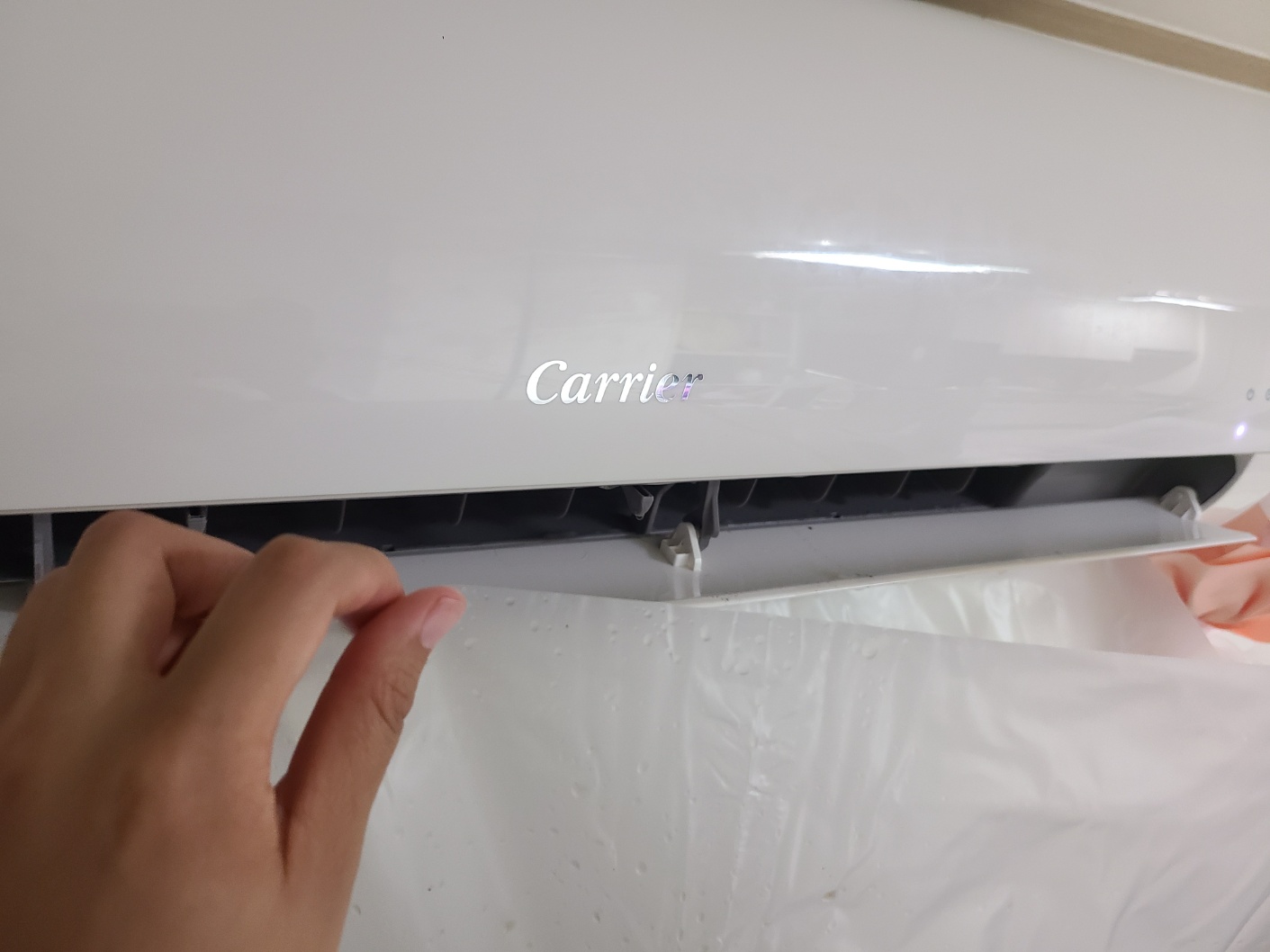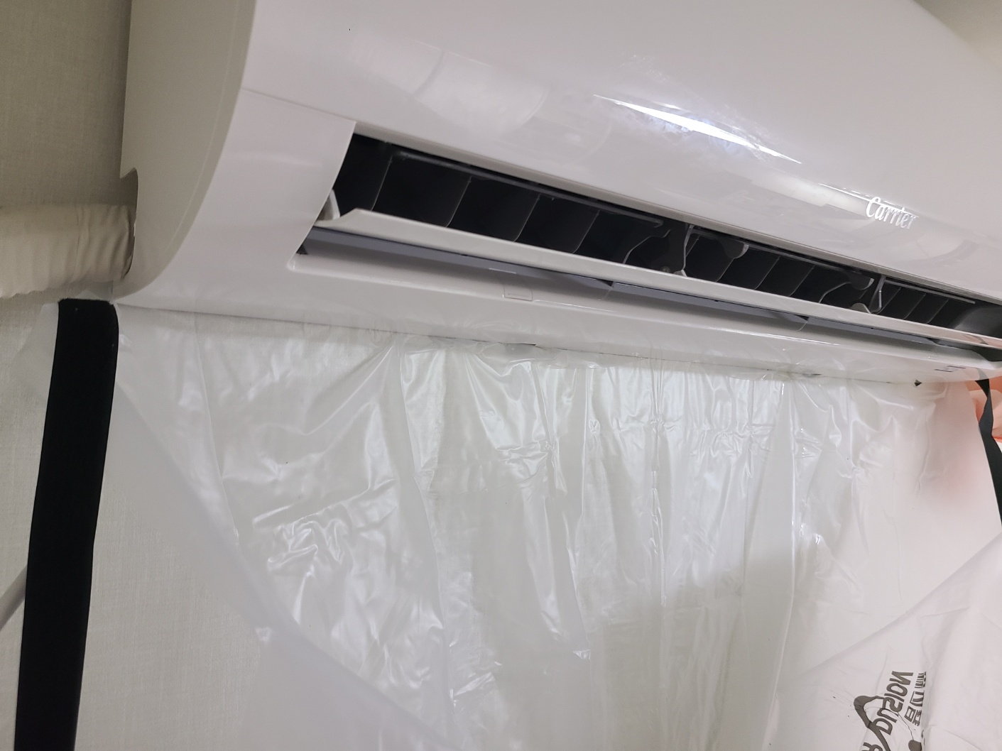 힙겹게 비닐 끼우기 작업 완료. 벌써 지치는 느낌..? 이렇게 앞면의 비닐이 좀 애매하게 떨어지는데 나중에 에어컨을 가동하면 에어컨 바람에 비닐이 날려 튼튼한 삼각 커버가 형성됩니다. 비닐이 꽤나 단단한 재질이라, 돈이 더 들더라도 빌리네집 에어컨 청소 키트용 비닐을 따로 구매하기 잘 한 것 같아요.