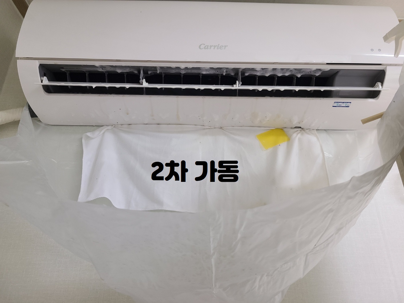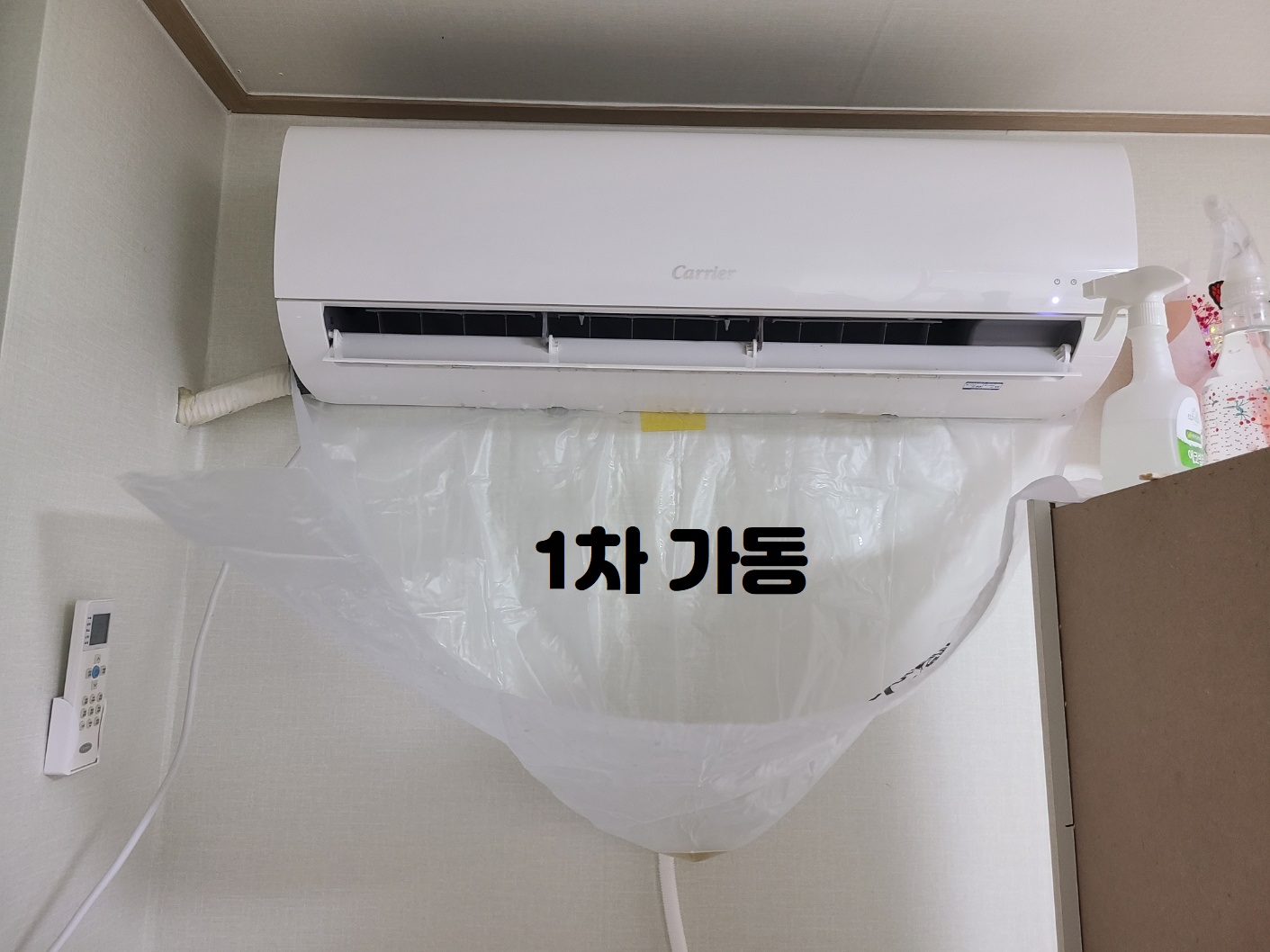 이제 5분 가량 에어컨을 작동시켜 줍니다. 에어컨 내부에 세척제가 가득 묻어있는 상태라, 에어컨 가동 후 초반에는 세척제가 사방으로 튀더라구요! 그래서 1~2분 가량 이렇게 비닐을 위로 올려 잡고 꾸정물이 주변으로 튀지 않도록 고정하고 있었어요.