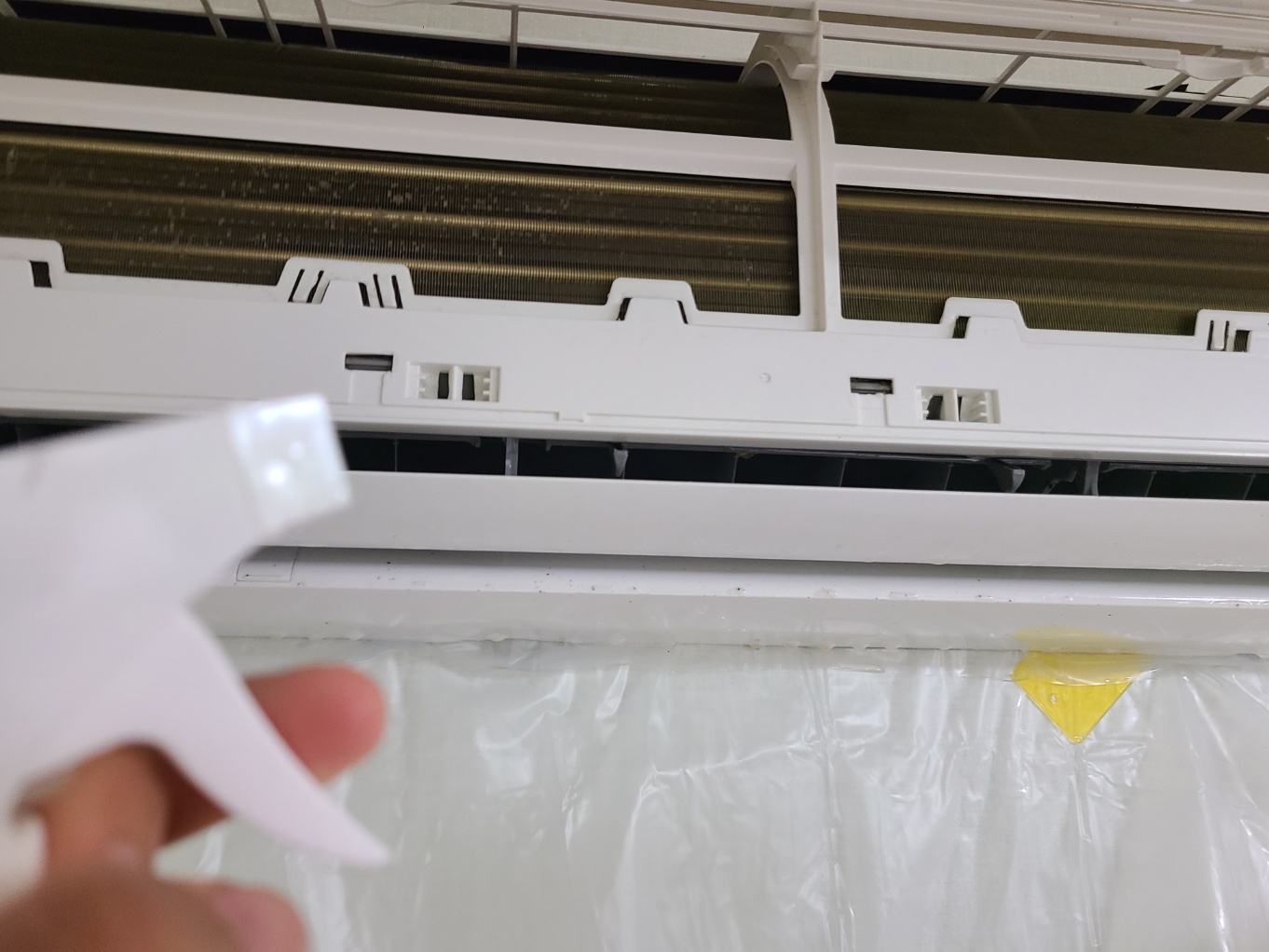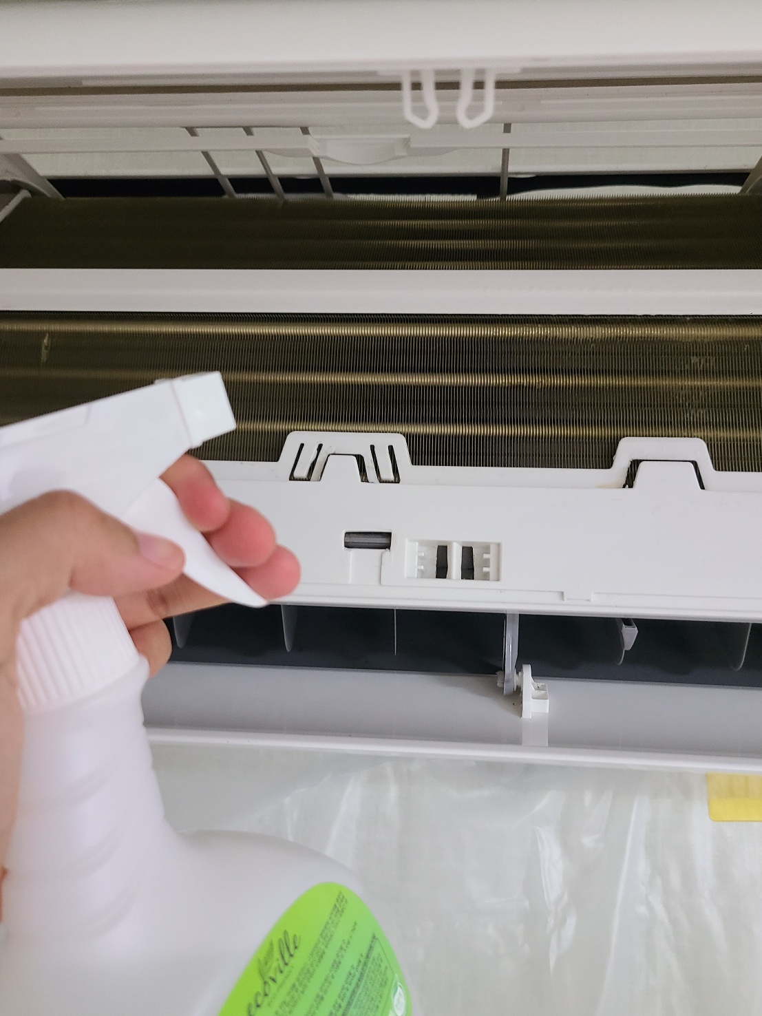 이제 청소를 시작해볼까? 에코빌레 에어컨 세척제를 냉각핀에 먼저 골고루 뿌려주었어요. 냉각핀에 먼지가 심할 경우, 부드러운 솔로 냉각핀을 결대로 긁어 이물질을 제거하면 됩니다. 냉각핀은 날카로우니 꼭 손조심 하시구요!