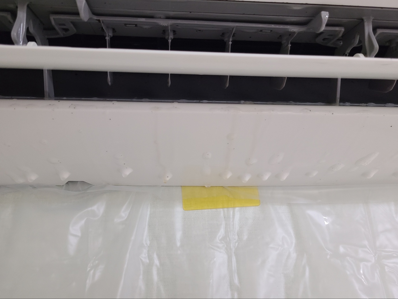 냉각핀에 뿌린 용액은 에어컨 밖 외부로 빠져 나간다고 들었는데, 송풍구에 뿌린 용액은 이렇게 모두 하단으로 흘러내려요. 커버링 작업을 하지 않으면.. 대참사가 일어날 거예요. 그러니 꼼꼼한 커버링 작업은 필수랍니다! 곰팡이 꾸정물이 뚝뚝뚝