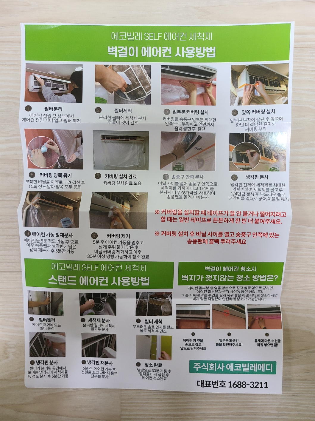 에코빌레 에어컨 셀프 세척제. 커버링 비닐이 함께 동봉되어 있는데, 후기로 보아도 그다지 튼튼해 보이지 않아서 에어컨 셀프 청소 키트를 따로 구매했어요. 에코빌레 에어컨 세척제의 사용 방법은 세척제를 송풍구, 냉각핀에 골고루 분사하기만 하면 된답니다.