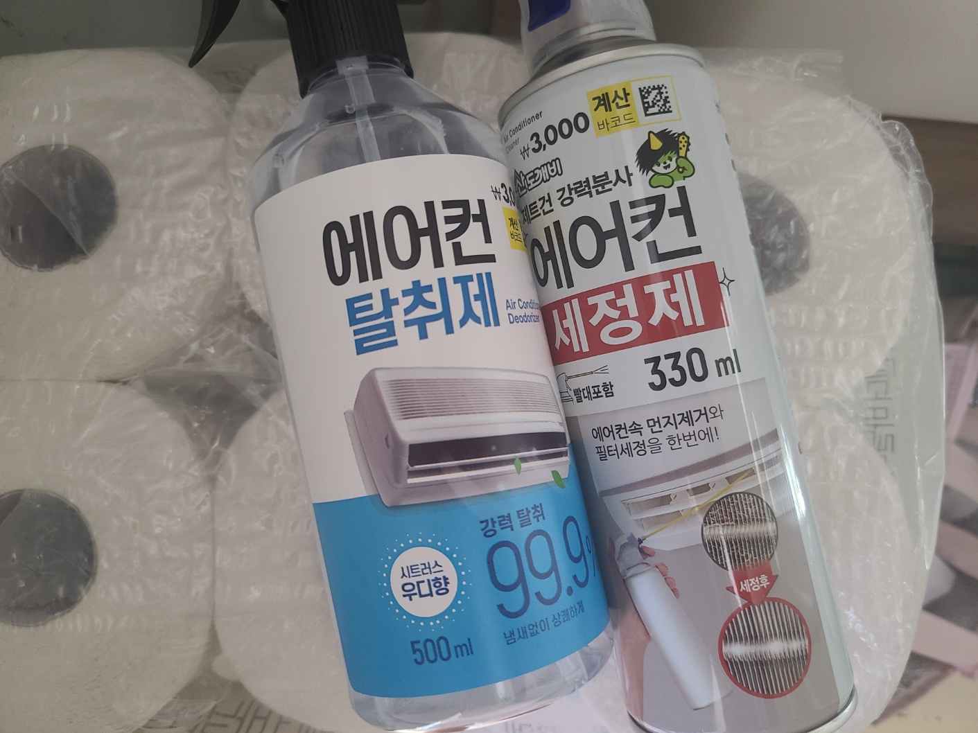 우여곡절 과정을 먼저 설명해보자면.. 에어컨 청소에 삘이 꽂힌 저는 다이소로 달려가 에어컨 세정제, 에어컨 탈취제를 사봤어요. 에어컨 세정제는 산도깨비 제품이 유명하답니다! 해당 세정제는 에어컨 필터를 끼워두는 냉각핀에 뿌리기만 하면 되는 용도예요.