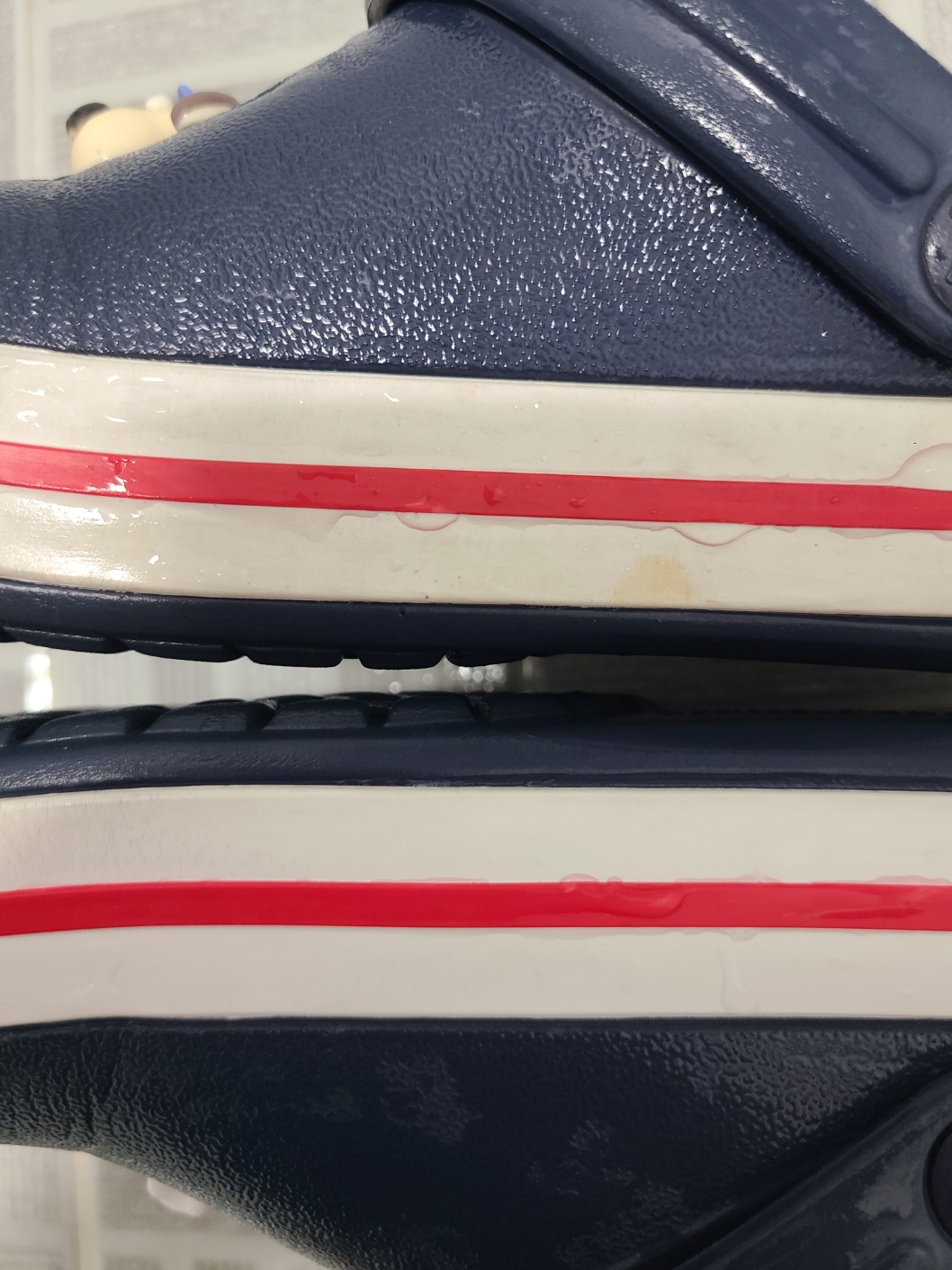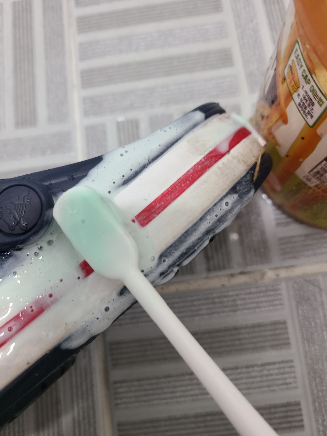 칫솔이 지나간 자리가 순식간에 하얗게 변한 모습이 느껴지시나요?🙏 정말 빡빡 문질러 닦는 수고로움 없이 가볍게 문질러 닦아도 크록스 때가 개운하게 사라지는 것을 느낄 수 있었어요.