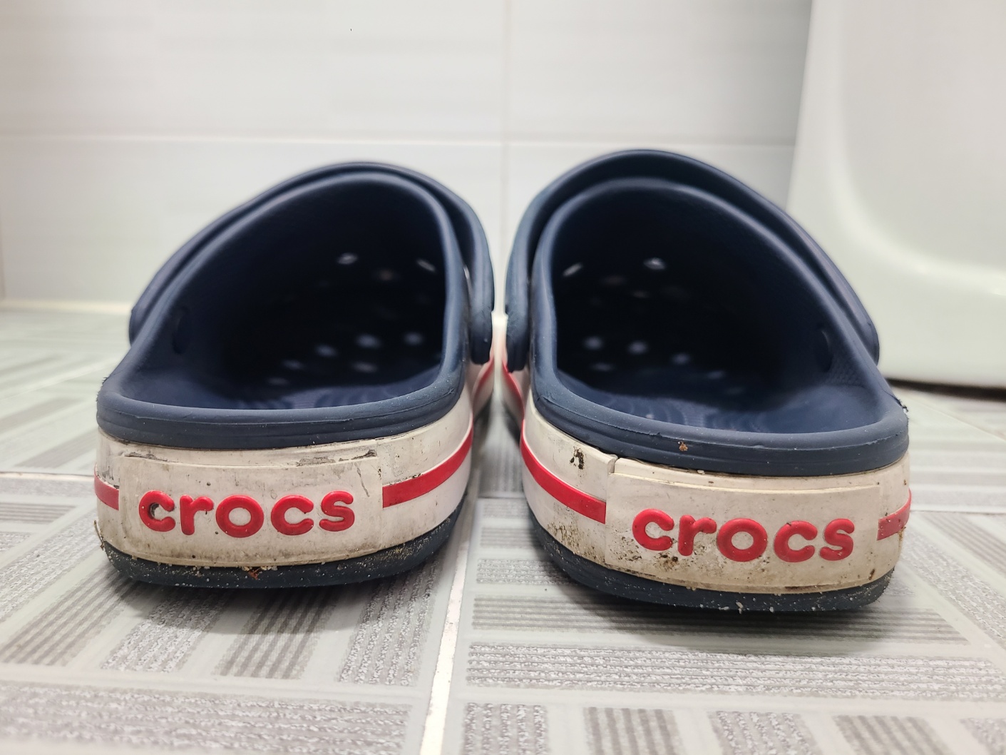 크록스를 매일 신다보니 흙과 먼지, 때가 끼어 신발이 많이 지저분해졌어요. 움직임에 의해 자글자글 주름도 생기고, 군데군데 흙 자국과 얼룩들이 묻은 상태입니다. 크록스의 흰색 고무 부분은 오염으로 누리끼리해졌어요!