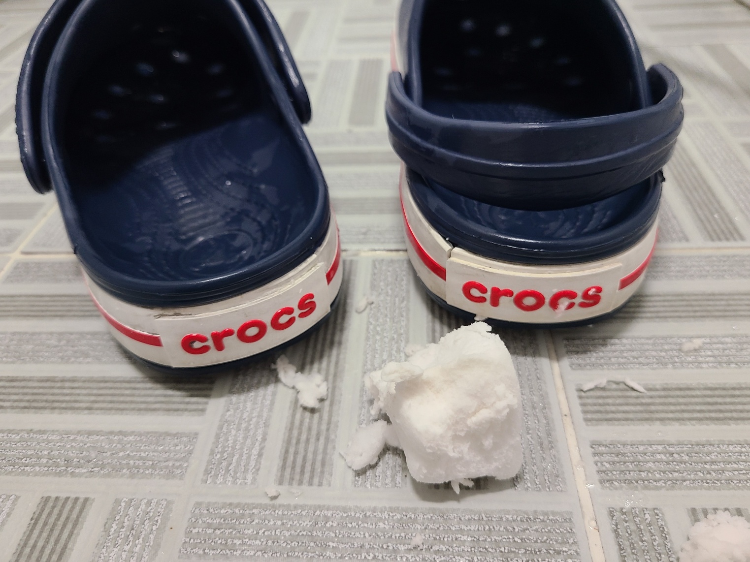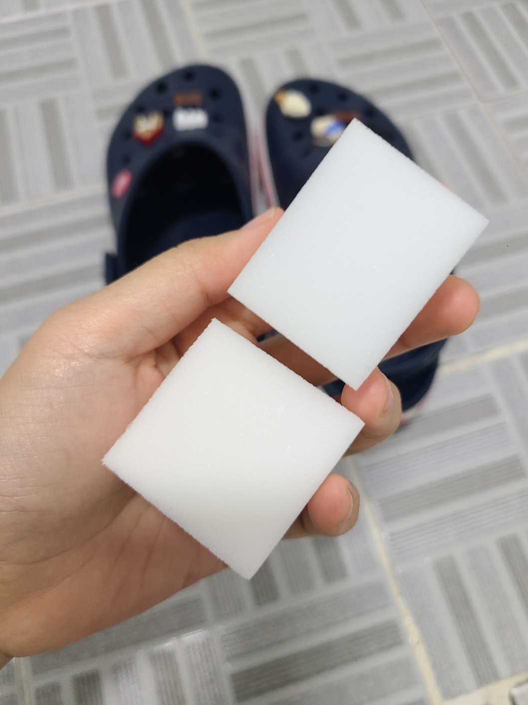 크록스는 합성소재로 만들어진 신발이라 매직블럭을 사용한다고 해서 표면이 손상되지는 않는다고 하니 나름 안심하고 사용할 수 있었어요. 매직블럭은 만능이라고 생각하고 지저분한 뒷창을 쓱쓱 문질러 보았는데 매직블럭이 지우개 지워지듯 가루가루 날리며 풀어지는 것 아니겠어요? 크록스 하단 고무창은 줄무늬와 마크로 인해 표면이 평면으로 고르지 못하기 때문에 매직블럭을 편하게 사용하기는 다소 어려움이 있었습니다.