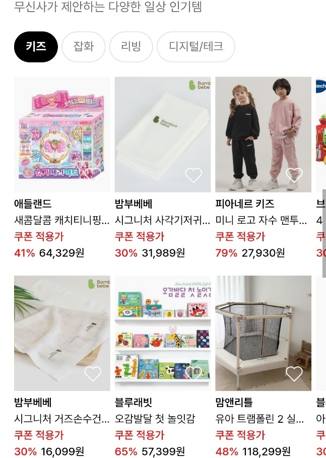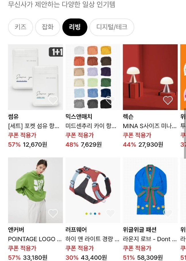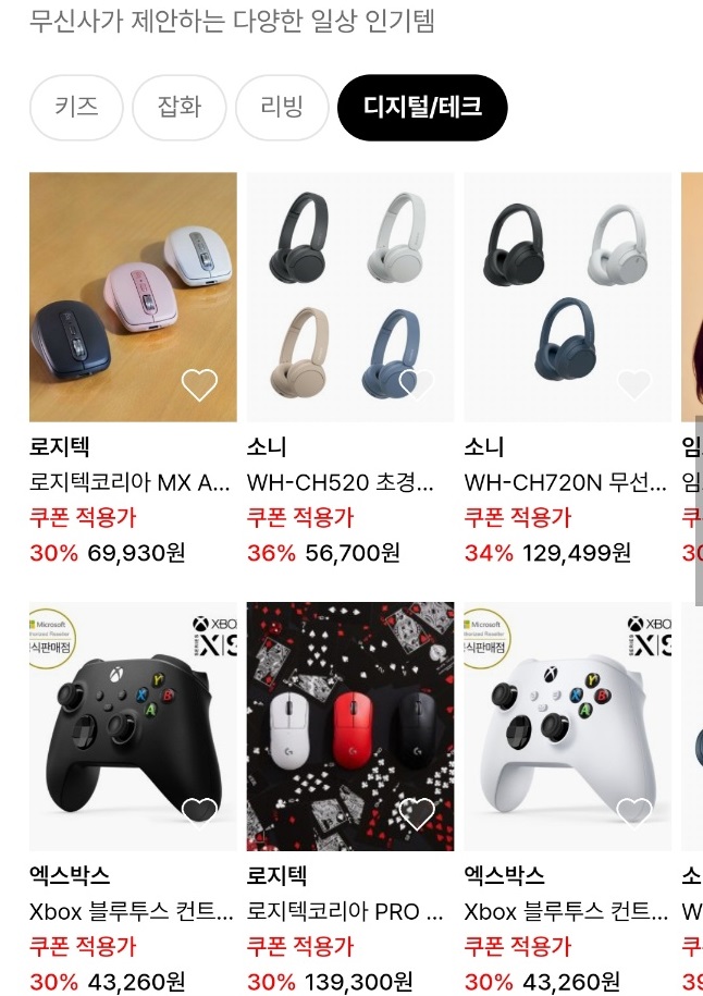 슬라이드를 통해 무신사가 제안하는 각종 일상 인기템 정보도 모아보았습니다. 키즈부터 잡화, 리빙 심지어 디지털/테크 분야까지 다양한 제품을 둘러볼 수 있어서 재미있더라구요.