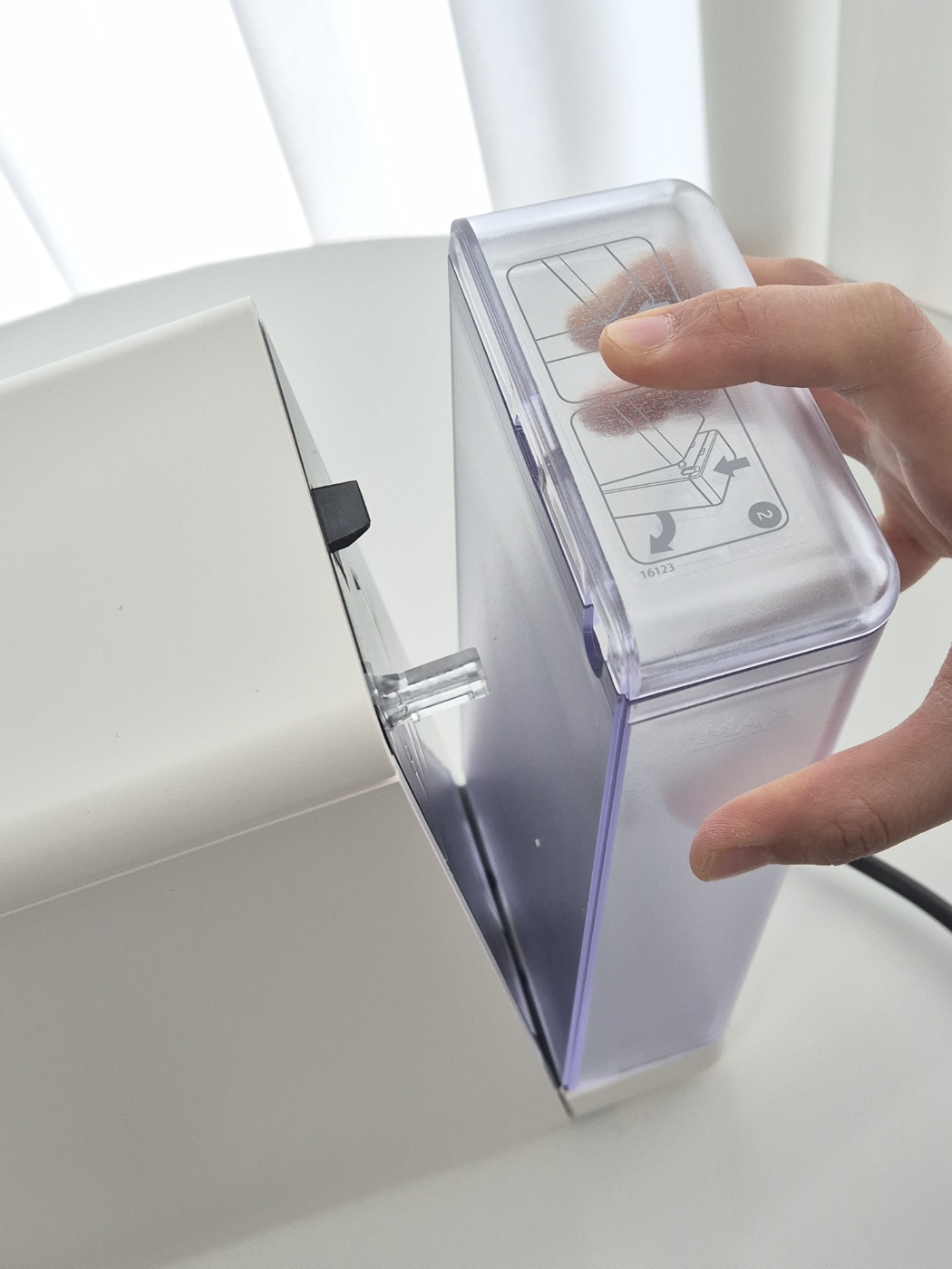 물통을 아래로 누르고 뒤로 밀면 쉽게 분리되어요. MAX 선 이내로 물을 채워줍니다.