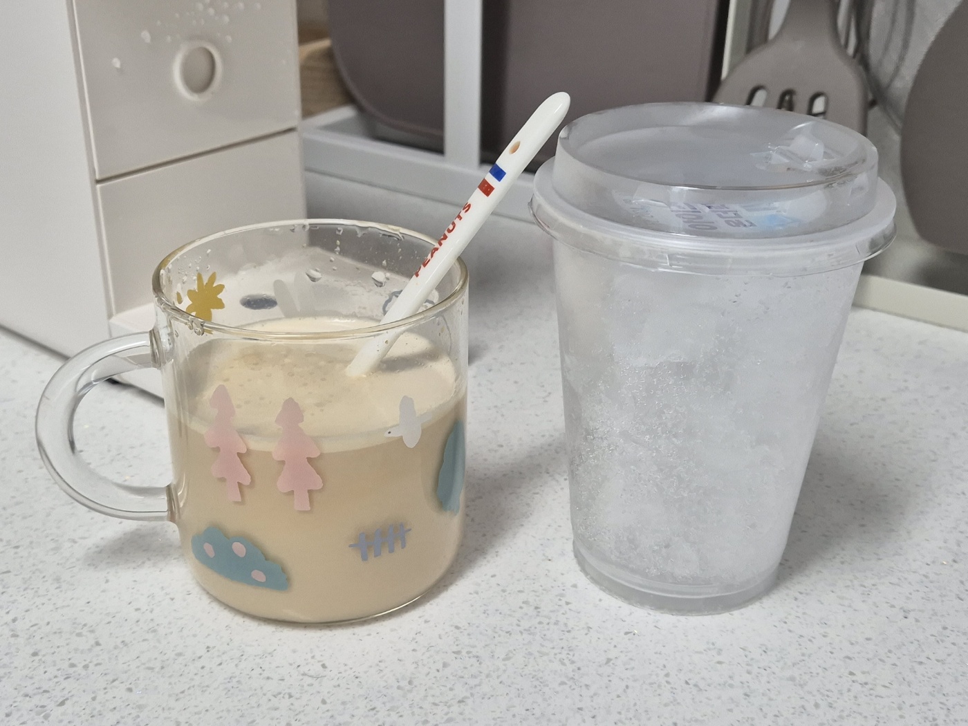 저는 에스프레소 추출 후 바닐라 파우더를 넣어서 바닐라 라떼를 만들었어요! 냉동실에 잠들어있던 얼음컵 소환~