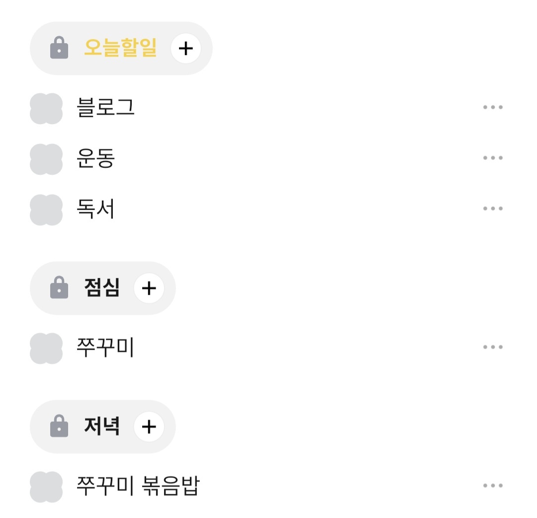 제가 설정한 오늘의 할 일 목록입니다. 루틴 설정을 통해 일상에서 매일 반복되는 일들을 쉽게 관리할 수 있어요! 또 1인가구 자취생으로서 매일 오늘 식단이 고민인데, 어플을 통해 일주일 식단을 정해두니까 냉파에 효과적이더라고요.