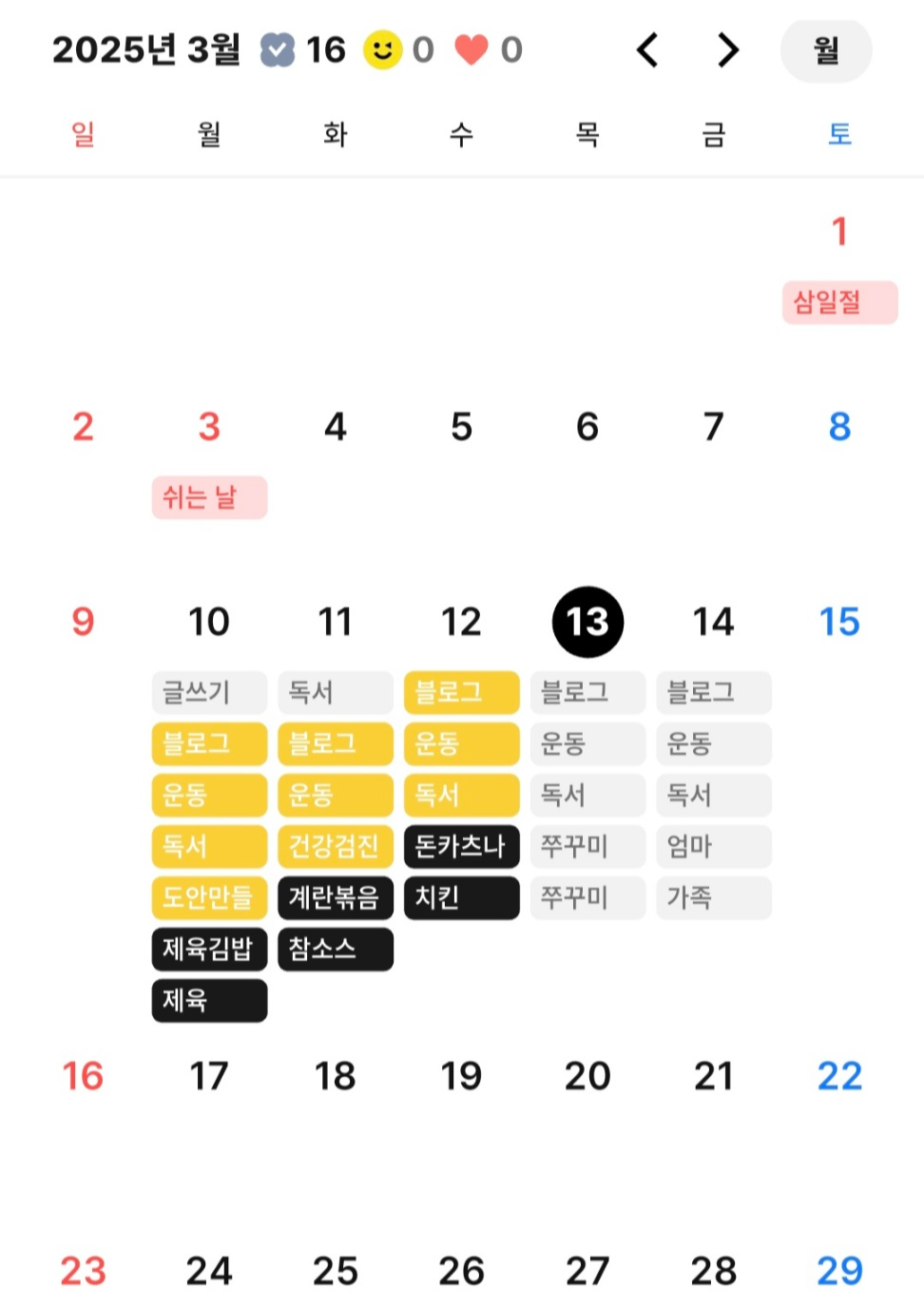 또 달력과 연동되어 일정을 시각적으로 한 눈에 파악하기 쉽고 귀여운 달력 구성이 포인트입니다. 달력 테마를 개인 취향에 따라 다양한 색으로 변결할 수 있어서 나만의 개성 있는 달력을 만드는게 재미있고, 예쁘게 꾸며진 달력을 보면 성취감도 커요.