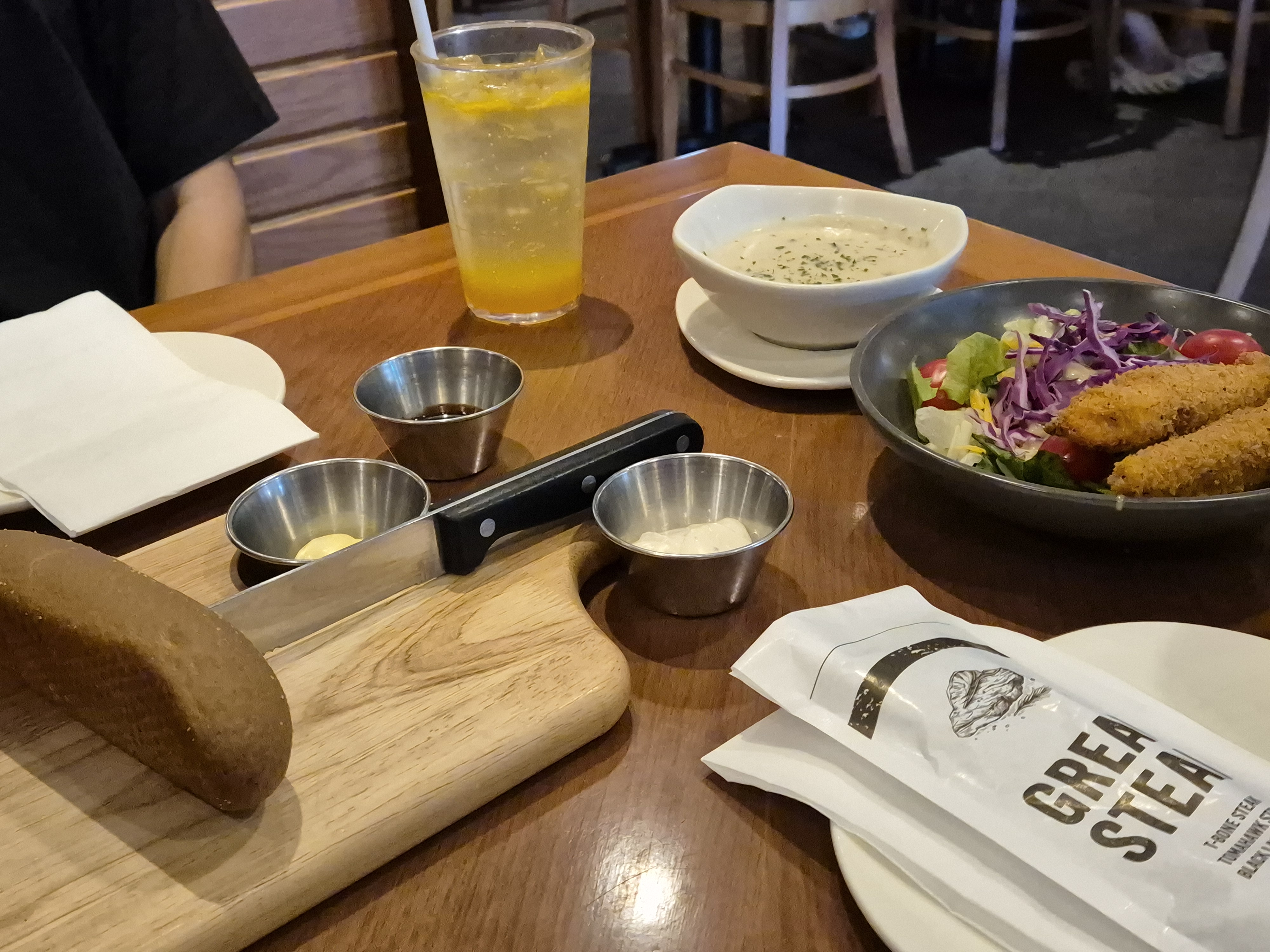 3) 숨겨진 부시맨 브레드의 비밀! 소스 3종 즐기기: 기본 망고 스프레드 외에 초코 소스와 블루치즈 소스도 요청하면 함께 받을 수 있어요. 취향에 따라 골라 먹는 재미가 쏠쏠하답니다. (스테이크 주문 시 소스도 종류별로 달라고 하면 기본 제공 소스 외 골고루 주십니다.)