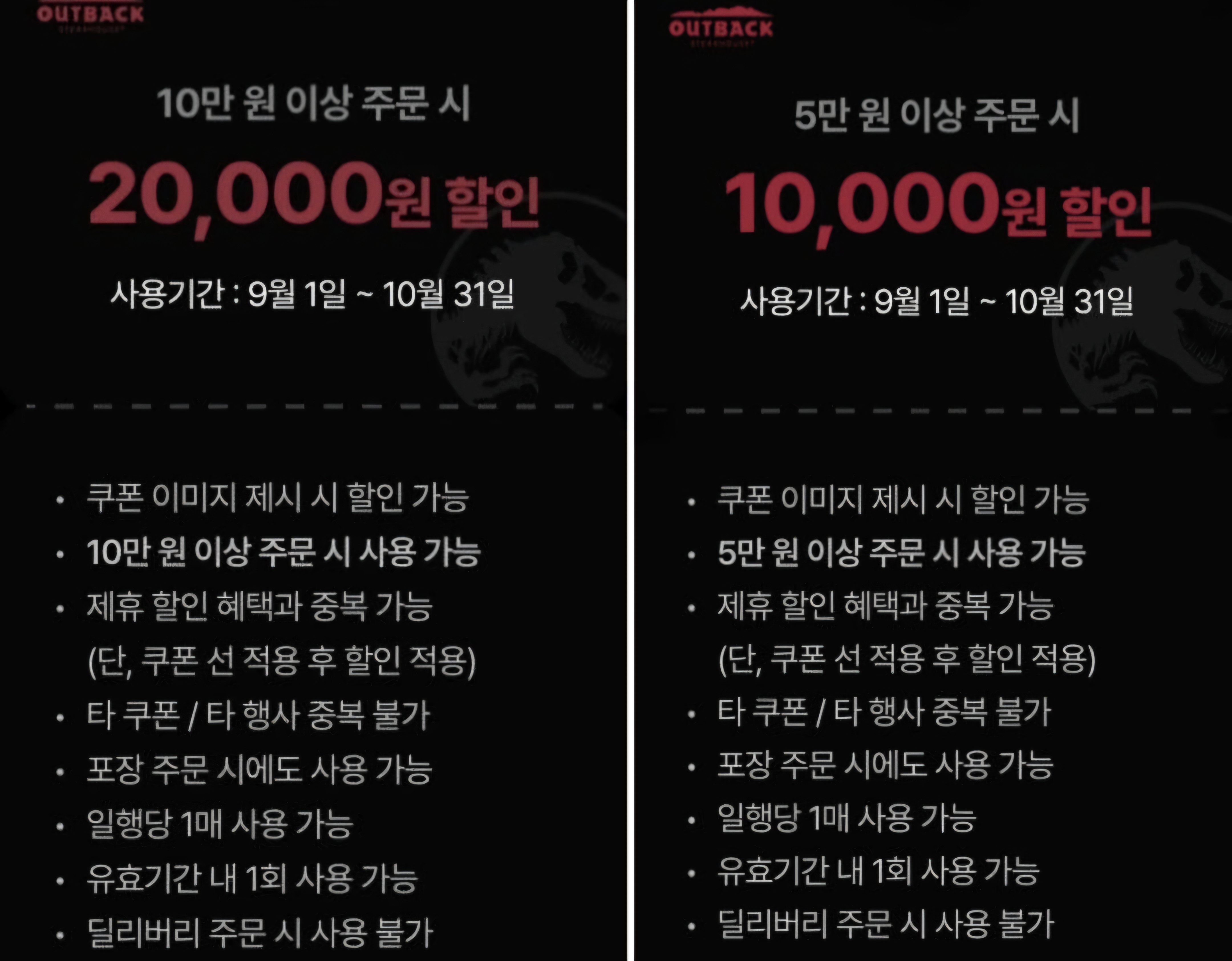 아웃백에서 공식으로 뿌린 쥬라기 쿠폰입니다. 쿠폰을 캡쳐해서 저장해두셨다가, 결제 시 직원 분에게 보여드리면 즉시 할인 가능해요.